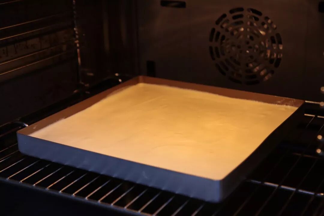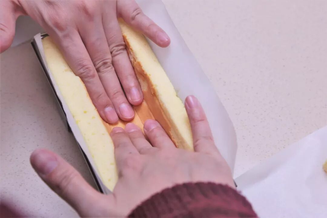 ⑦烘烤完成后,取出脱模,晾凉时需要在蛋糕卷上下各垫上一张烤纸为蛋糕卷保湿。