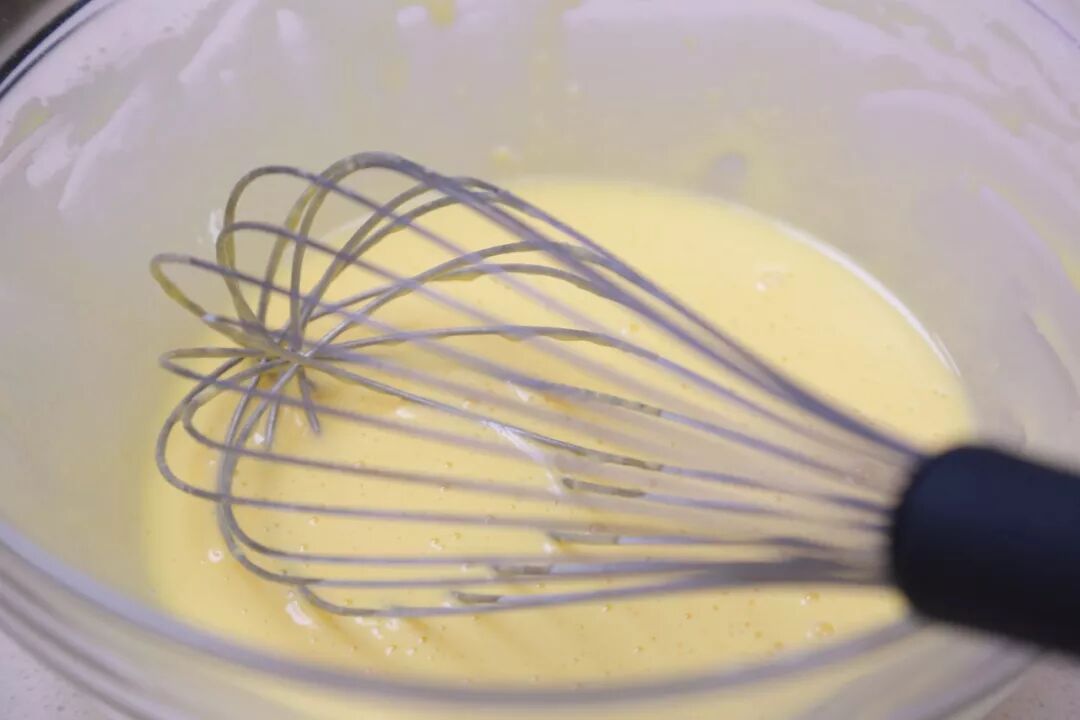 ①蛋黄与蛋白分离,蛋黄尽量保持室温,蛋白放冰箱冷藏或冷冻,此时可开始以上下管摄氏200度预热烤箱。蛋黄依次加入水、玉米油,搅拌均匀、达到乳化状态。