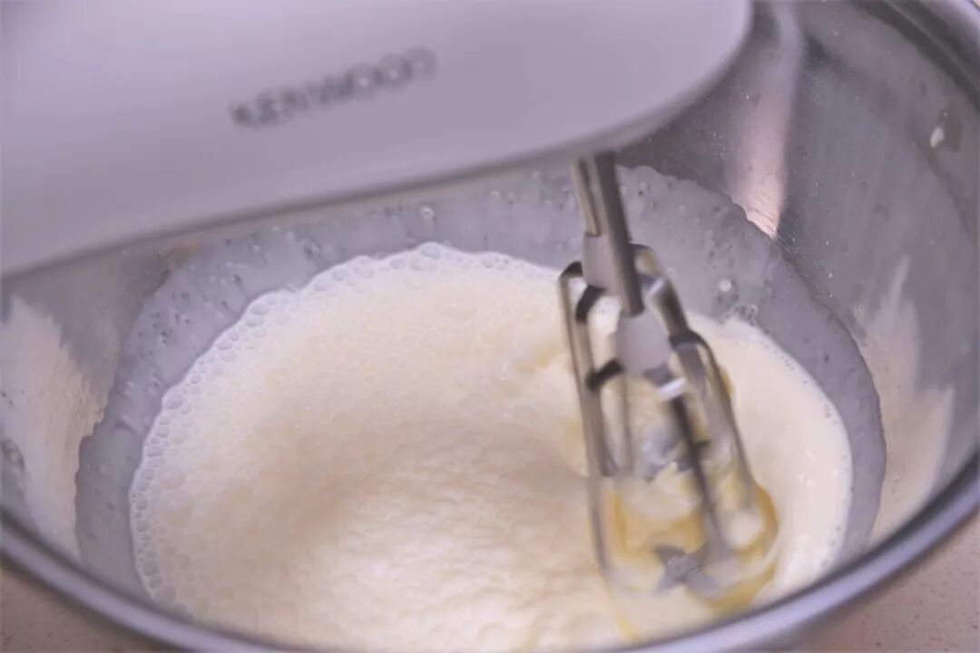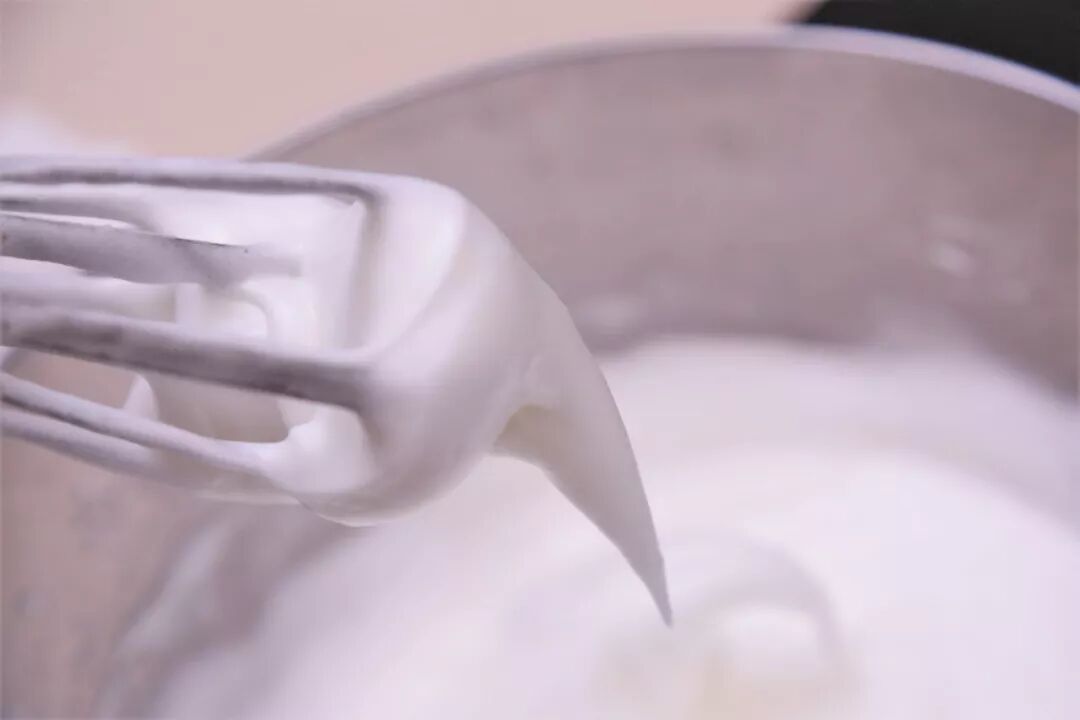 ③将蛋白从冰箱取出,分三次加入细砂糖,打发至湿性发泡。