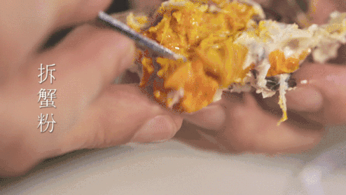 接着,另外准备蒸熟的大闸蟹,由拆蟹师拆解。不仅有蟹黄蟹膏,还有整条的蟹肉,俗称“蟹粉”。第三步仅需把拆出的蟹粉倒入先前熬好的蟹油,进行简单的炒制即可。