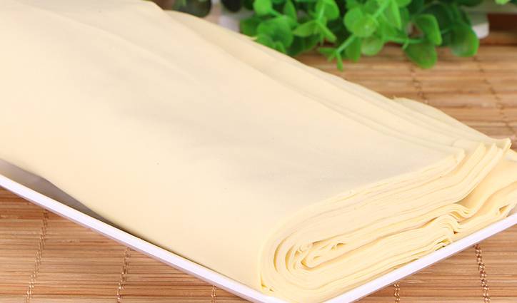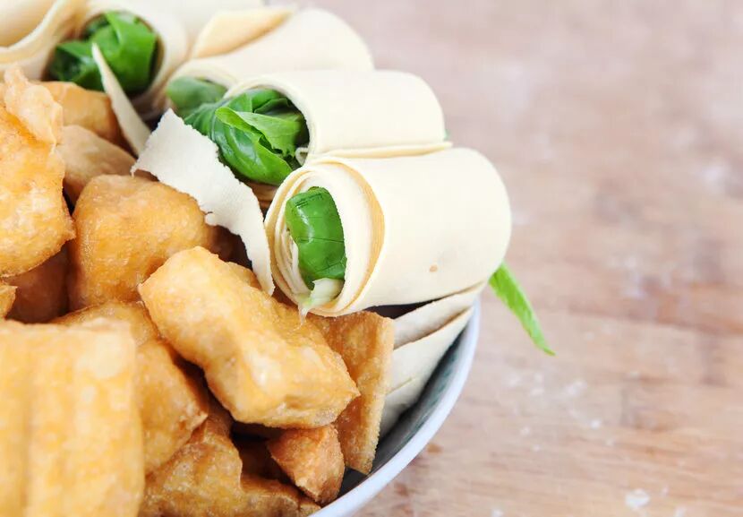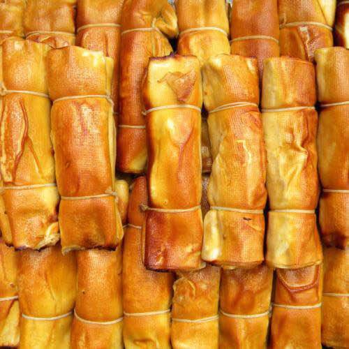 干豆腐卷里还可以裹进调好的肉馅,蒸熟以后再放到熏锅里,锅底调糖熏成棕红色,就是别有风味的熏肉卷。而韧性更好的千张还能打成结,可以包上肉馅打结煮着吃,或者打成结和五花肉同焖。