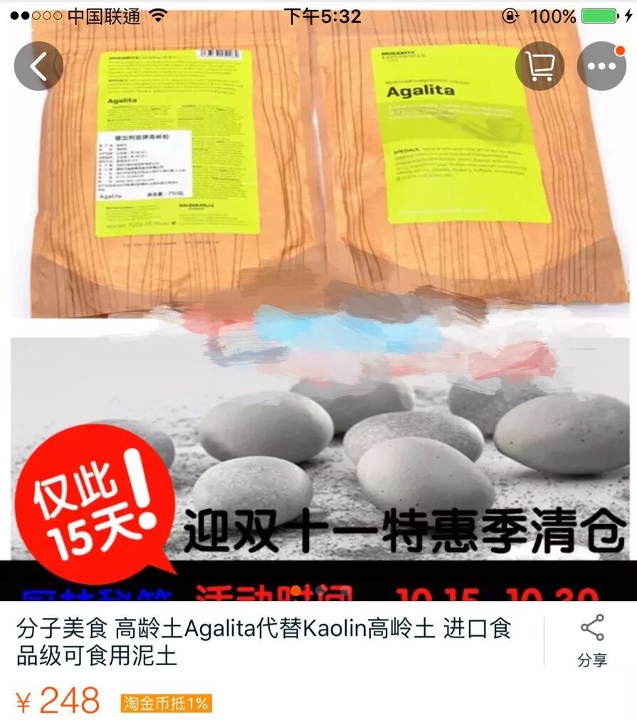下图是某宝上卖的可食用土,看看这进口包装,名字还很复杂,中英文结合,可是!你以为你改个同音字我就认不出你了吗?高龄土是什么鬼啊!年岁很高的土吗?其实是高岭土好不好!也许说高岭土你不太清楚,但观音土这个名字是不是耳熟能详?