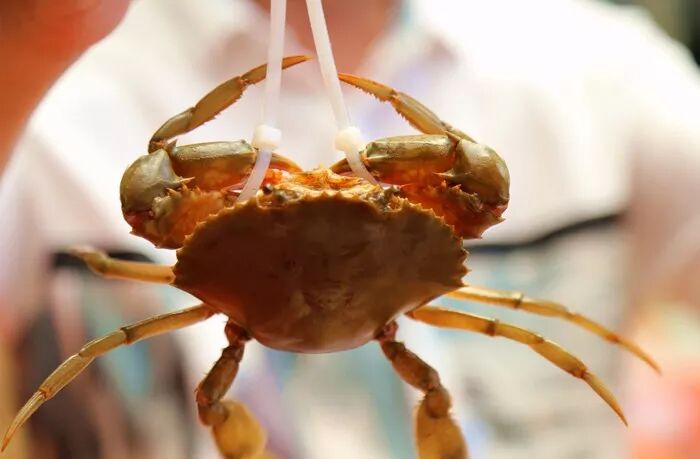 而“蝤蛑”说的就是青蟹,古人这样描述青蟹的威猛:“蝤蛑大者,两螯至强,能与虎斗”;青蟹属的学名“Scylla”一词,源于希腊神话中著名的女海妖斯库拉,她有六个脑袋,盘踞在意大利半岛和西西里岛间的墨西拿海峡,每当船只经过她都会吃掉六名水手。由此可见,青蟹绝对属于不好惹的狠角色,这也难怪市场上的青蟹总是被“五花大绑”。