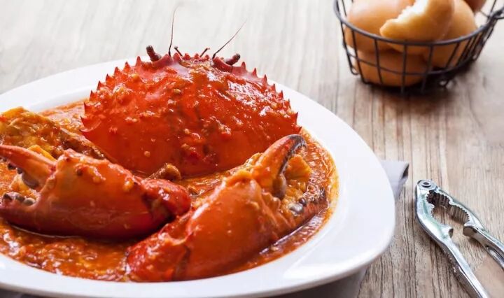 虽说世间好物,利在孤行,但青蟹同样胜任浓重的调味。四面环海,地处热带的新加坡,当地人青睐鲜辣口味以排遣闷湿。新加坡国菜“辣椒螃蟹”(Chilli crab )就是经典的例子,鲜活的东南亚大青蟹,搭配以辣椒和番茄调制而成的浓稠酱汁,先用蒜蓉和米醋爆香,再倒入蛋液勾成银狐芡。大块朵颐,酱汁涌动,沾满十指,鲜香甜辣的滋味可以让人忘却一切。