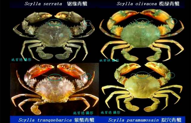 锯缘青蟹(Scylla serrata)额缘齿较高,因此而得名,大螯和泳足上的深绿色网纹十分明显,所以又俗称“沙蟳”或“花脚”,在东南亚一带也被称为“斯里兰卡蟹”。锯缘青蟹在四种蟹里体型最大,性情暴烈,可以长到3公斤左右;紫螯青蟹的螯足呈紫色,又俗称“紫蟳”;橄绿青蟹的螯足偏橙红色,因此又称“红脚仔”或“番蟳”,后两者个头中等。