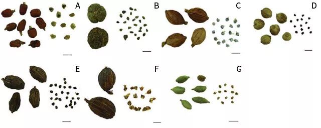 几种带“豆蔻”二字的植物果实及种子比较:A. 大高良姜 Alpinia galanga(红豆蔻);B. 草豆蔻 Alpinia katsumadai;C,艳山姜 Alpinia zerumbet(“草豆蔻”);D. 白豆蔻 Amomum testaceum;E,香豆蔻 Amomum subulatum;F,草果 Amomum tsao-ko;G小豆蔻 Elettaria cardamomum 图:cmjournal.org