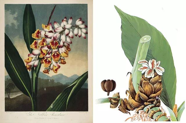 艳山姜(左)的花序和草果(右)的花序完全不是一个画风 图:plantillustrations.org/epharmacognosy.com