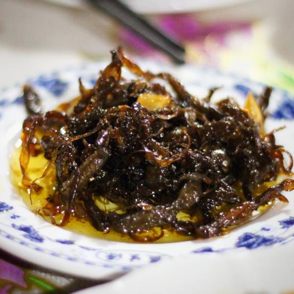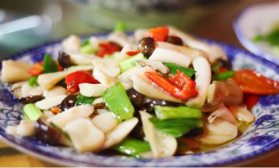 看过舌尖二的吃货们一定还记得那个手一碰就变青,刀一切就变黑的神奇菌子。见手青是牛肝菌中最出名的一种,较其他牛肝菌品种,其肉质更加细软鲜嫩、滑爽厚实,名副其实的“牛肝”菌。重油猛火下足配料再高温爆炒,焦香的腊肉和肥腻的菌肉一起咬下,便满嘴生香幸福满足。