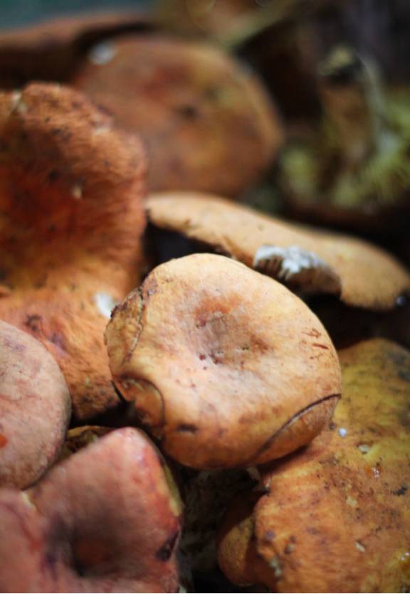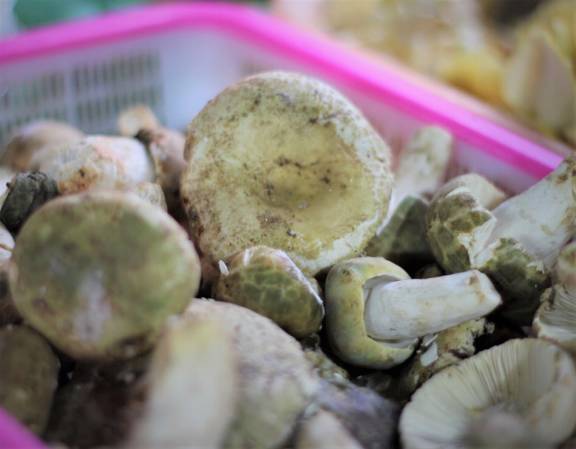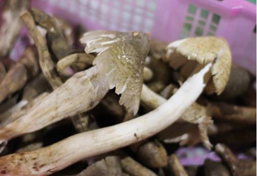 市场上见到的奶浆菌学名叫做多汁乳菇(Lactarius volemus),据说因为伤口都会流出乳白色类似牛奶的液体,因此得名奶浆菌。由于店家速度发现并拍开了我伸向奶浆菌的恶魔之爪,不能帮大家检测断口流汁的传闻,我很惭愧。