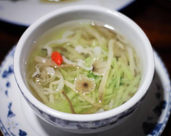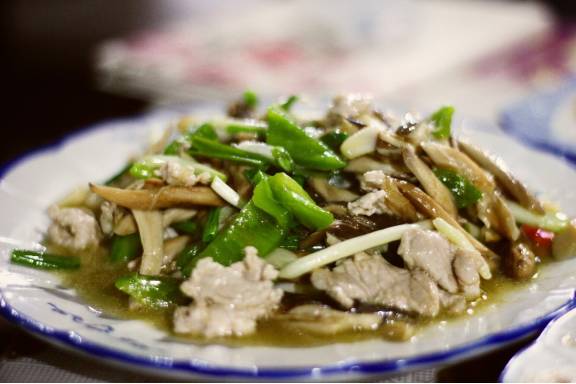 当地的特色菜品是用白参菌来蒸蛋羹:直接在云南特色小汽锅里浅浅打匀半锅鸡蛋液,浸入扯碎的白参菌撒上薄盐后便直接上锅蒸;热力先把白参菌蒸熟渗出汁水,汤汁再把蛋液稀释成嫩蛋羹;起锅时撒上葱花,靠热力和汤汁浸透。这样蒸出来的白参菌蛋羹不仅口感鲜嫩,嚼来还有山野清香,挖一勺浇到饭上,一口气便能吃掉一大碗!(饭桶本质暴露)