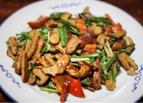 如图所示,奶浆菌看起来一点也不白,闻起来一点也不奶,吃起来一点也不浆,在各类食用菌子中是个非常神奇的存在——因为它的口感是木……木……的……别的菇都是丝滑纤维的口感,奶浆菌吃起来就像豆干一样。所以处理这个菌子非常考验厨师的手艺——酱汁浓稠度的调配、猛火爆炒的时间——需要非常高的技巧才能体现它浓郁的菌香和厚实的嚼劲,一不小心就会因为炒过火而使得口感更加干硬。(很好奇会有喜欢吃这个豆干菌子的小伙伴么,大家评论里来交流一下呗)