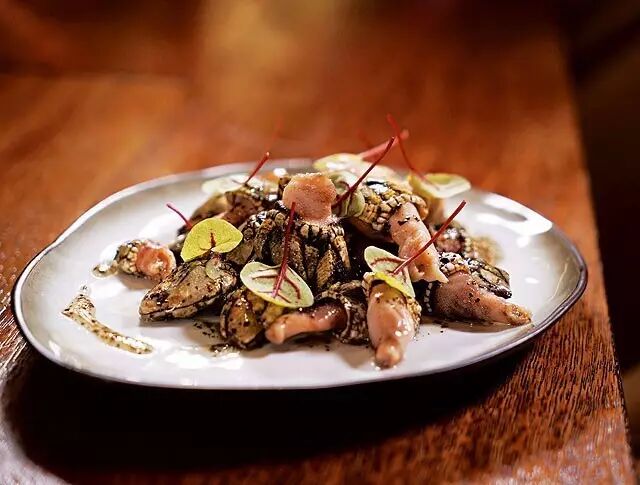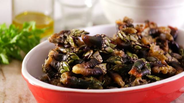 鹅颈藤壶与橄榄油、红葱头、罗勒和胡椒一起翻炒,淋上白葡萄酒和鲜奶油小火炖煮,最后挤上些许柠檬汁,就着面包一起入口。即使是浓重的口味也掩盖不了藤壶本身的绝美,那股浓缩的海味会在口中久久萦绕。