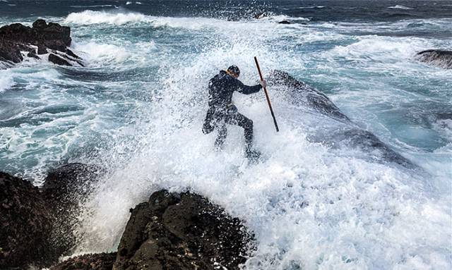 猎手们借助绳索垂降到海面附近,撬凿采集陡峭石壁缝隙中的鹅颈藤壶。他们需要预判海浪侵袭的节奏,适时爬上裸露的锯齿状岩礁,尽可能多的收集藤壶并塞进腰间网兜,赶在下一波大浪来袭前返回安全地带,稍有闪失就有被海浪吞噬的危险。