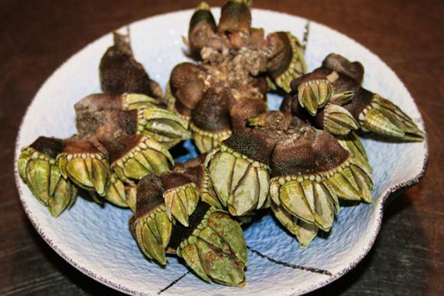 “藤壶”虽然雌雄同体,但倾向于异体授精。它们自身无法挪步,于是许多藤壶演化出了超长的那话儿,即使不能朝夕相伴你左右也要将精子递送到你枕边,这类藤壶的交配范围可达身体直径的20倍。不过,这些“藤壶”都不太好吃,真正能被称为珍馐的是铠茗荷目指茗荷科(Pollicipidae)的一些成员,比如龟足(kamenote)和鹅颈藤壶(goose neck barnacle)。“丑陋”的外表下,是让人垂涎的味觉体验。
