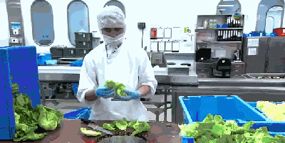 和普通餐食不同,飞机餐更加注重安全卫生,原材料在前期清洗时,先人工检查,再用低温的清洗机清洗保鲜,然后才会送去加工。