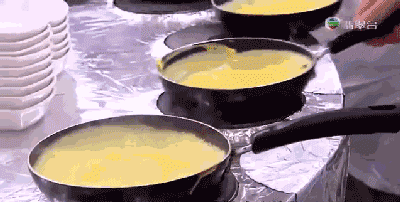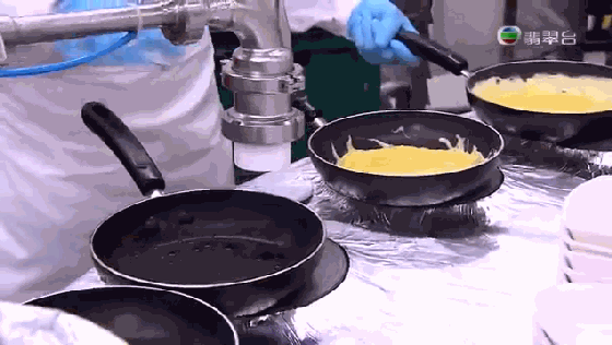 每个锅的下面是加热装置,从流出蛋液到成型装盘,锅刚好转到下一个操作者的手边。