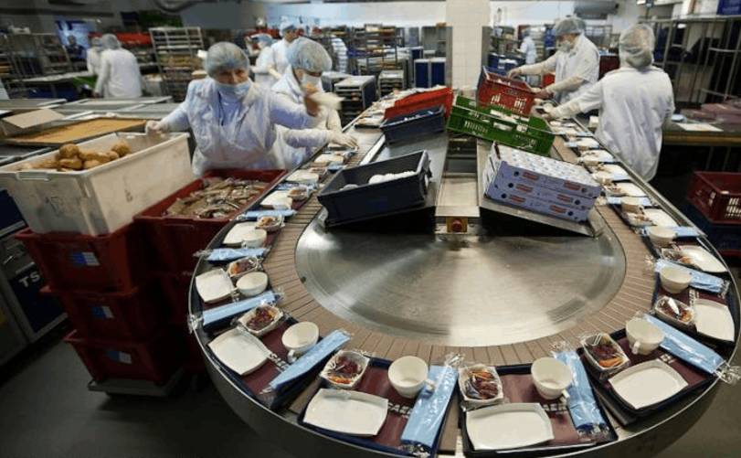 有些航食工厂也会利用传送带摆盘 图:englishrussia.com