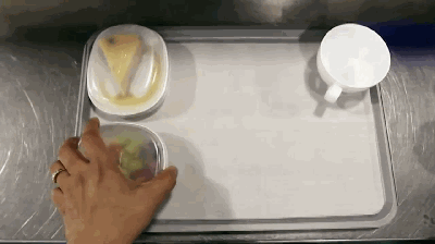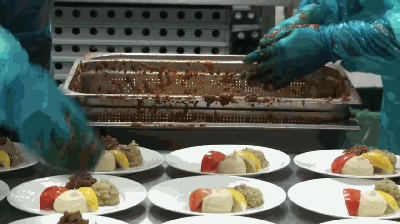 制作好的食物都需要快速降温,保证食物的安全性。急冻后的食物根据是否需要在飞机上翻热被送往不同的分装部门。需要在飞机上翻热的食物会被送往摆餐部,操作人员会按照不同航空公司的指定餐盒,将餐品摆好。为了保证食品安全性,整个摆餐过程不可以超过45分钟,食物表面温度不可以超过15℃。