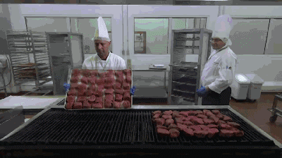 有些航空公司会提供西式餐点,比如烤牛排。一次烤一托盘,撒调料、翻转,有条不紊,行云流水。