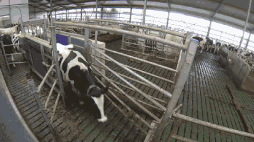 每头牛都拥有一个专属的电子耳标,它就是牛的电子ID,在返回牛舍的通道门上装有ID识别系统,它可以识别奶牛的身份,引导牛只回到自己所属的牛舍去。