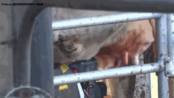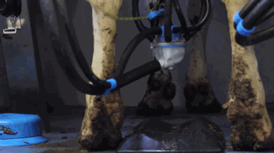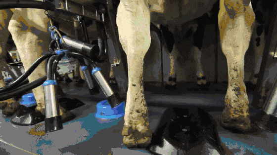 预挤奶之后,将真空杯套在乳·房上,利用真空泵把奶吸出来,流到集乳杯里。