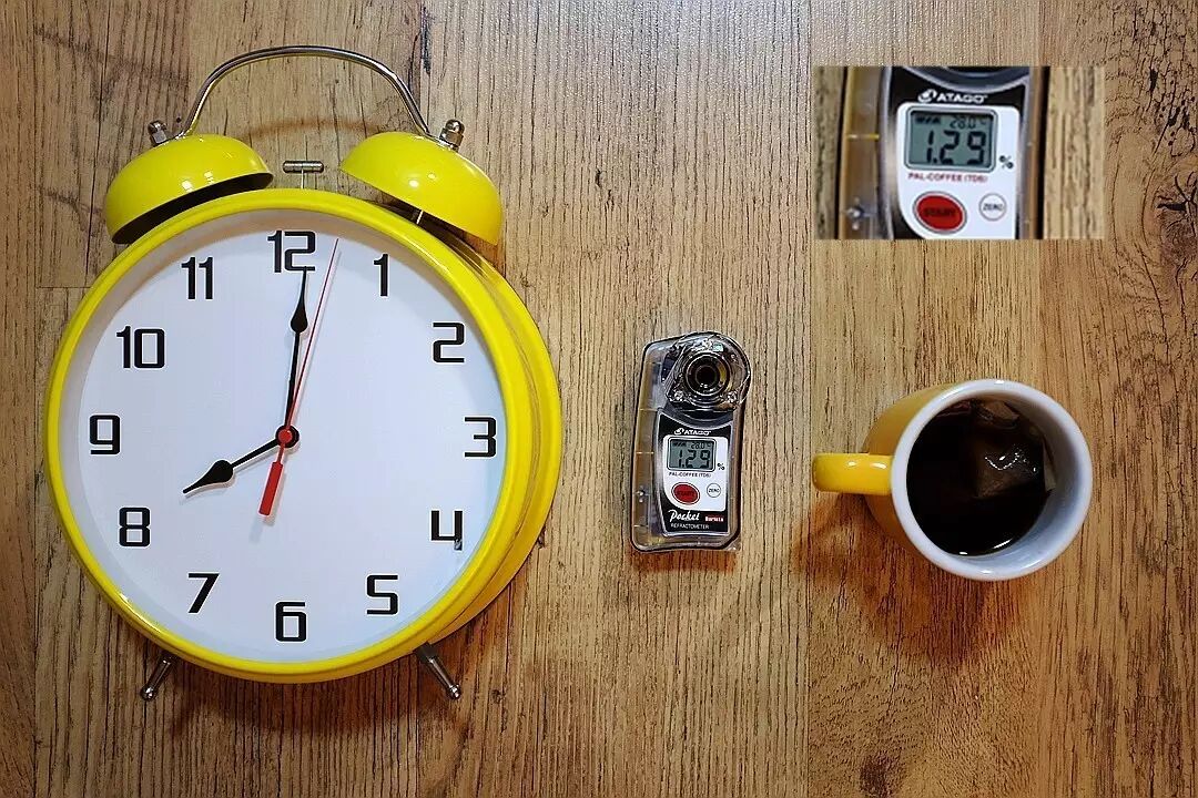 8小时之后,使用咖啡浓度仪测量浓度,达到了1.29%。