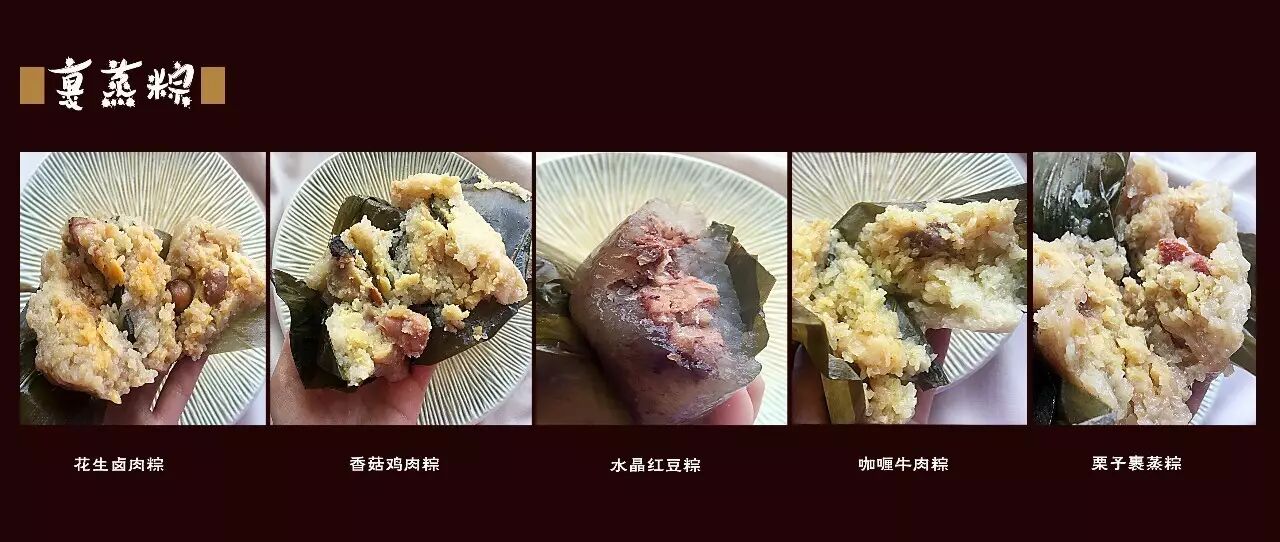 裹蒸粽的口味也有非常多种,除了普通的蛋黄肉馅外,它某些口味可以说是很标新立异了。花生卤肉粽是大粒的卤花生跟一块块绿豆馅儿混合,里面的蛋黄很大粒,还有莲子和栗子;咖喱牛肉粽吃起来很像牛肉糯米饭啊,小块的土豆被糯米包裹着,煮熟后很香,糯米里都是咖喱粉的味道,咸咸辣辣的;冬菇鸡肉粽,冬菇和鸡肉的搭配很清香鲜美,里面竟然还有蛋黄,很是惊喜;甜口的粽子里,有西米做的水晶红豆粽,能吃出椰汁的味道,一小块一小块香芋藏在里面,很Q弹有嚼劲,吃着像热乎乎的冰皮粽子...................