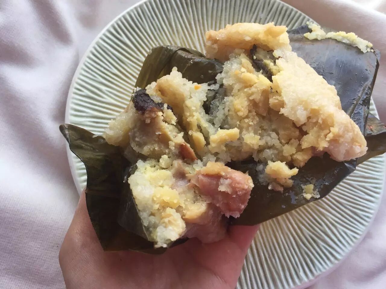 裹蒸粽的口感,跟别的粽子口感不同,它是咸甜口的。粽子里包裹着一层绿豆馅是甜的,绿豆馅儿底下才是流油的蛋黄或者咸肉馅儿。咸甜交缠交织,吃一两个很惊艳,吃多了就觉得腻。裹蒸粽另一个美味的地方在它选用的糯米,不是一粒粒的长糯米,是小粒紧致的圆糯米,不粘牙,煮久一点就会很糯。