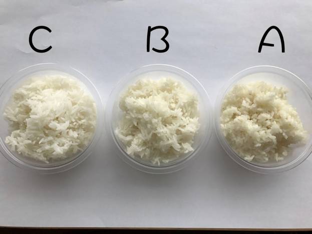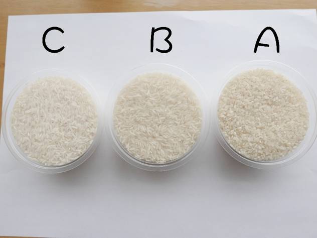 我们考察的指标包括米饭的香气(米香)、米饭的外观、弹性、粘度、味道等,参与测评的有30人。测评的主角是就是下面三种米,我们就编号为A、B、C吧。