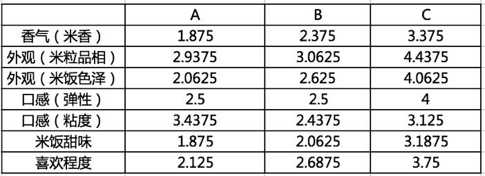 每个指标分别设计了1-5分,大家分别打分。这是几种米饭最终的测评分数。