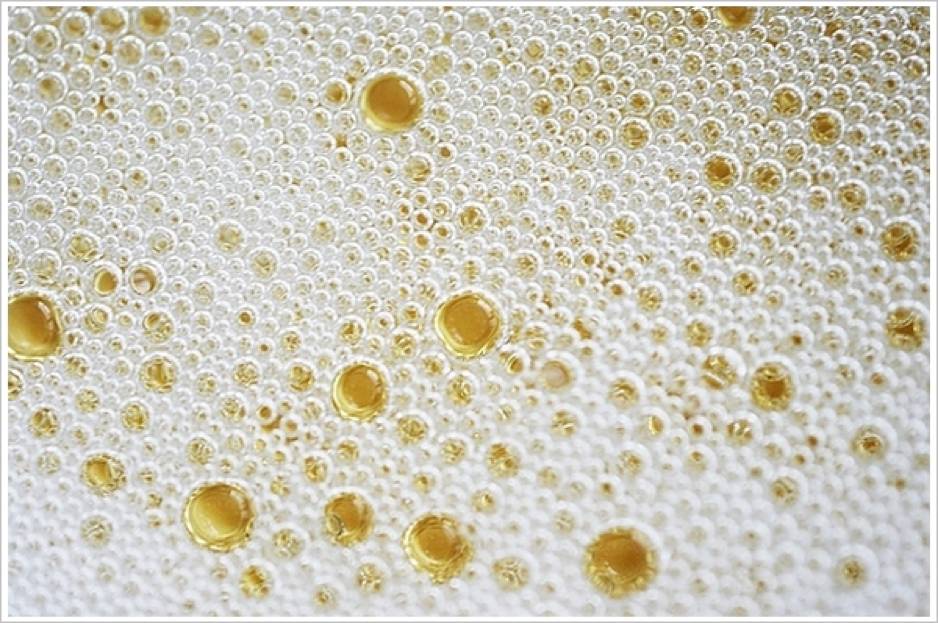香槟酒的气泡。香槟酒中的芳香有机物分子充当了表面活性剂,使气泡不会破裂成气溶胶。(图片:Wikipedia)