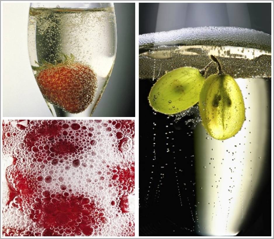 此外,香槟中气泡的形成不仅与压强和温度有关,还和一定的气化核心有关。气泡总是先在微小的固体近处或瓶子内表有毛刺处形成。试往香槟酒杯里放一小撮覆盆子(表面凹凸不平),随着果实下沉,香槟酒就会像开了锅一样冒出大量气泡,如上图所示。