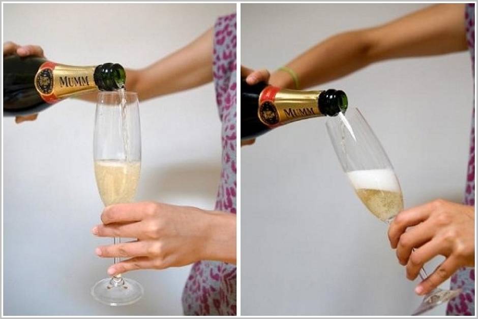 为了品尝到香槟的最佳风味,应该采取右边 “斜溜式” 倒法:将杯子尽可能倾斜,将瓶口紧靠杯沿,让香槟缓慢地沿杯壁流向杯底。左边是错误的 “直冲式” 倒法:杯子竖直,让香槟酒柱直冲杯底。对比可见,采用斜溜式倒法,香槟液体中产生的泡沫较少。(图片:theaustralian.com.au)