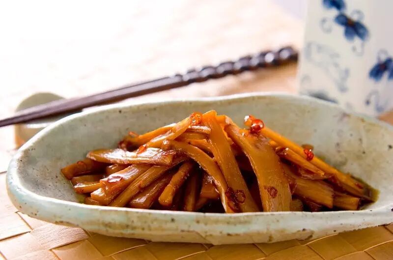 干燥的笋干若想要进入拉面碗里,则还需要经过煮发和调味的过程。煮发是要让水分重新回到笋干里去,先用水浸泡然后文火煮,如此反复就可以把薄如皮革的干制笋煮成脆嫩的笋干。不过刚刚煮发的笋干是没有味道的,还需要调味——把它放在油锅中炒熟,然后加入高汤和酱油煮干,就成了拉面中鲜香微酸的笋干了。