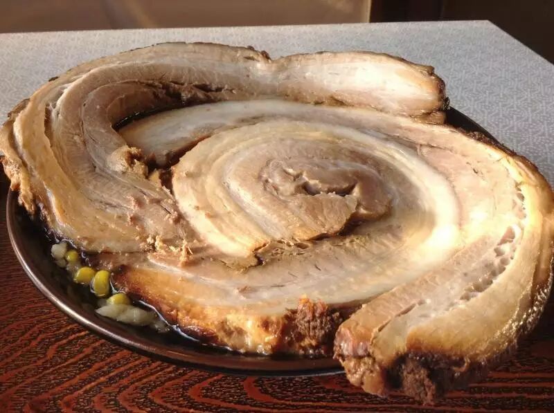 爱肉一族最喜欢的自然是拉面中的叉烧。虽然名字叫叉烧,但是和中国的叉烧在做法和口味上都没什么关系,咱们这边的叉烧是给猪肉抹上红红的叉烧酱放在炉子里烤出来的,是一种烤肉。而拉面里的日本叉烧是炖出来的,非要在中华料理中找到接近的食物的话,我觉得应该是酱肉或者酱肘子。叉烧不光可以用在拉面里,毕竟是肉嘛,直接吃毫无问题,中华冷面、炒饭、铁板烧等等料理中也经常出现它的身影。