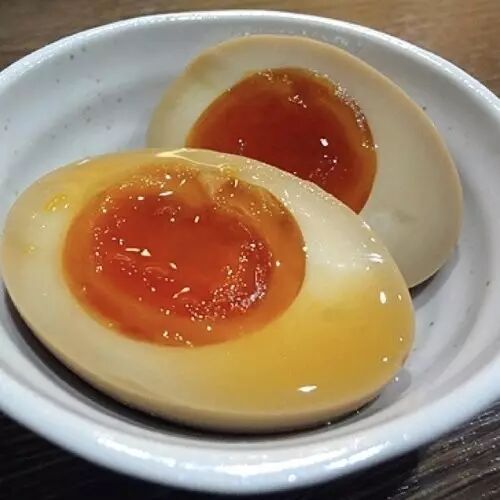 (这个玉子不是所长!不是所长!不是所长!)经常出现在拉面里的那个蛋黄半凝固的溏心鸡蛋,日文中叫做味玉子,就是调味过的鸡蛋的意思。味玉子的做法有两步,第一步是煮鸡蛋,第二步是让鸡蛋入味,煮鸡蛋人人都会,不过把鸡蛋煮成溏心的却需要技巧。鸡蛋从冰箱拿出来以后如果直接下锅煮会容易破,所以放置一段时间让它变成室温比较好,然后在沸水中煮6分半,关火继续放置30秒,捞出来在冷水中让它快速冷却,就能煮出来溏心蛋了,如果喜欢吃全熟的蛋黄,那多煮30秒就可以。调味的方法很简单,先在锅里放水、加入酱油、味淋、砂糖熬成调味汁,然后放凉,把煮好的溏心蛋剥壳浸泡在里面冷藏一晚就可以了。