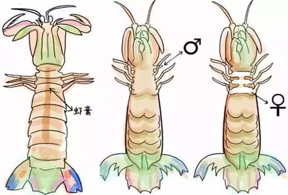雌雄虾蛄很好区分,腹部靠近头胸甲有三道白色的“王”字为雌,反之是雄虾。雌虾的生殖腺从头胸部一直延伸至尾节,成熟时充斥着饱满的橙色“虾黄”,透过半透明的虾壳清晰依然可见。