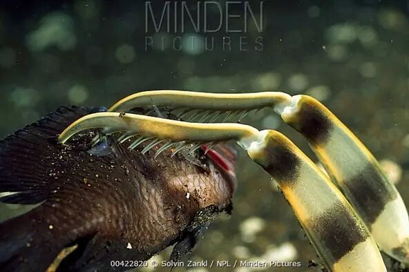 穿刺型虾蛄在捕捉鱼类 。图:Minden Pictures
