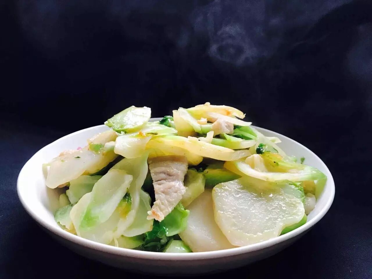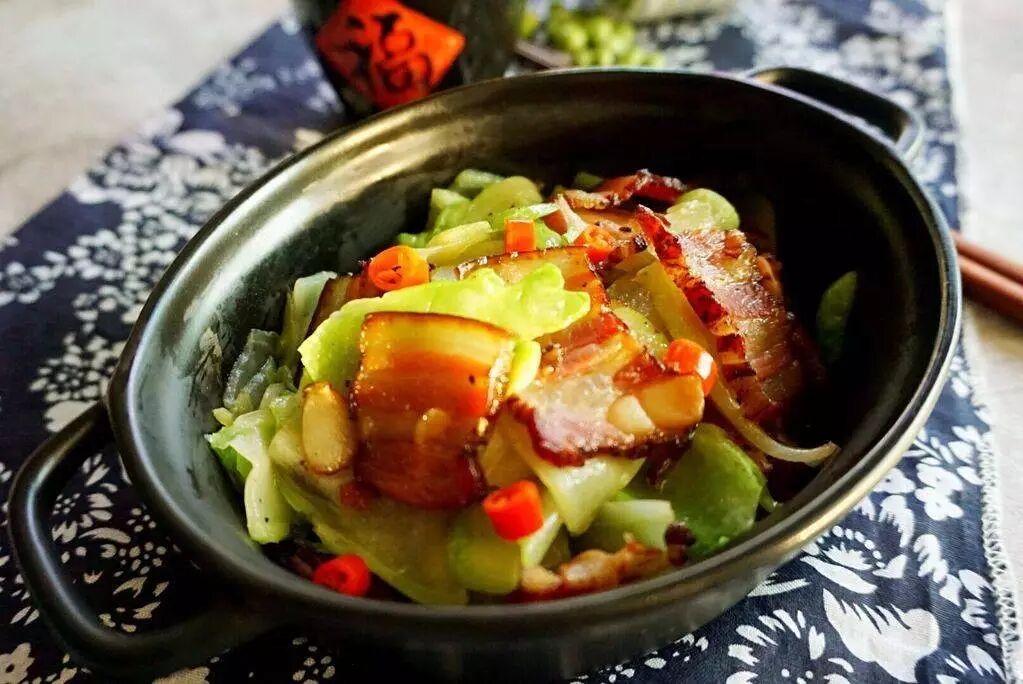 刚出锅的五花肉炒儿菜。图:豆果美食网友candy蝶