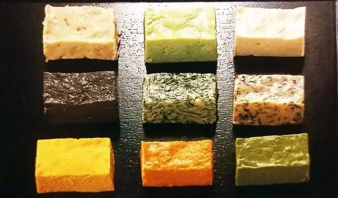 代表芝麻豆腐的拼盘,在怀石料理或素食料理上也经常被当成前菜的传统菜色,此外,在添加的原料上出现了丰富的变化,通常所见的有十二种,分别为:芝麻豆腐、山栀子芝麻豆腐、豆腐芝麻豆腐、花生芝麻豆腐、木耳芝麻豆腐、抹茶芝麻豆腐、毛豆芝麻豆腐、海带芽芝麻豆腐、海胆芝麻豆腐、蟹肉芝麻豆腐、黑芝麻豆腐、蛋黄松芝麻豆腐。