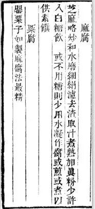 中国的饮食体系(包括器皿、大部分调味品以及桌椅的使用方式等),在宋代已经大抵完备。现代中餐的烹饪制作手法与近一千年前的宋代并无根本的差异。有一种宋代就有文献记载的食物,现在还有地方在吃,那便是麻腐。在北宋著作《东京梦华录》中,就有“麻腐鸡皮”的记载。到了明清相关文献越来越多,记载得也越来越详细,并且出现了更多的变化,除了用芝麻制作的“麻腐”,还有用牛乳制作的“乳腐”、用老菱制作的“菱腐”、用藕制作的“藕腐”、用罂粟子制作的“粟腐”。