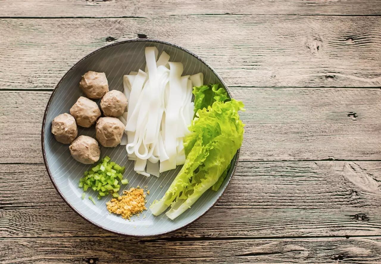 所需原料:牛肉丸、水、粿条、盐、生菜、炸蒜蓉、芹菜粒、牛杂