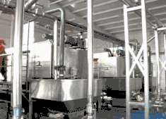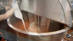 如果质检通过了,装有鲜番茄酱的箱子将会被送到空气泵下,以每分钟15公斤的速度抽往机器里的储藏池中,储藏池中的番茄酱会经过电脑调控将预定量的酱送入烹饪炉中。
