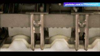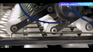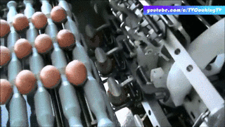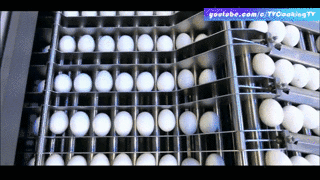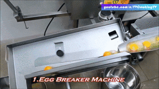我们先来看带壳生蛋,是如何变成单独的蛋清和蛋黄的。首先,被放在储存盘中的鸡蛋,顺着固定的通道,进入磕蛋机,停在蛋槽中,蛋的中段部位,受到上方零件的压力磕在下方硬片上,蛋壳一分为二,内容物被下方轨道接住,而蛋壳落入底层托盘。