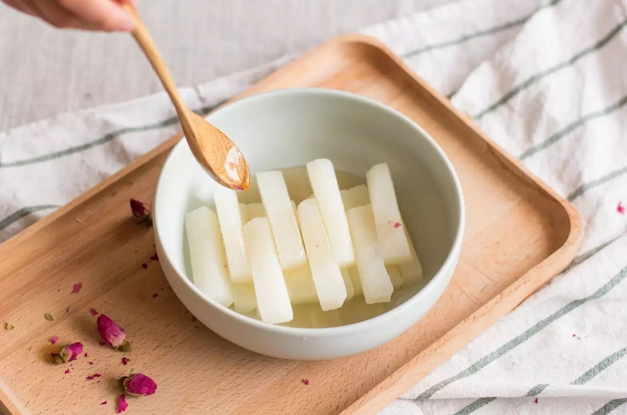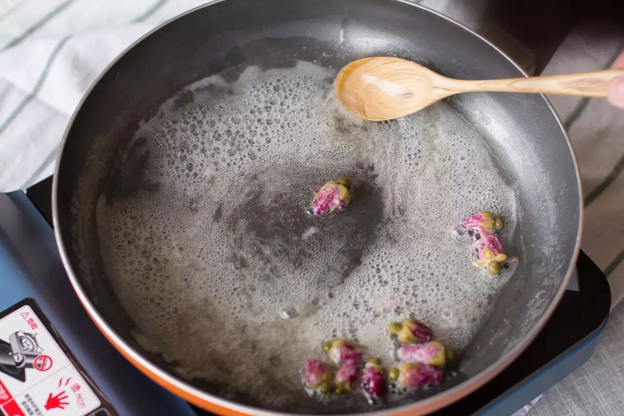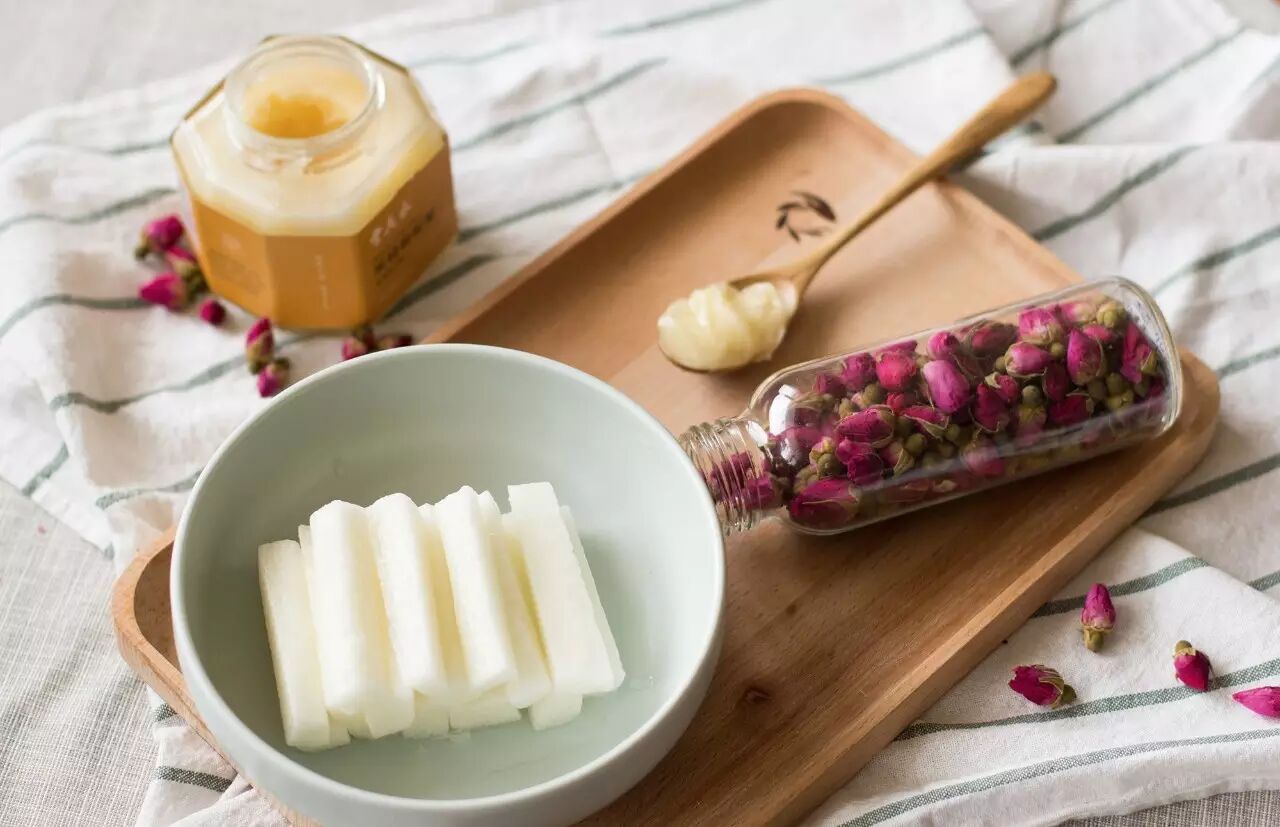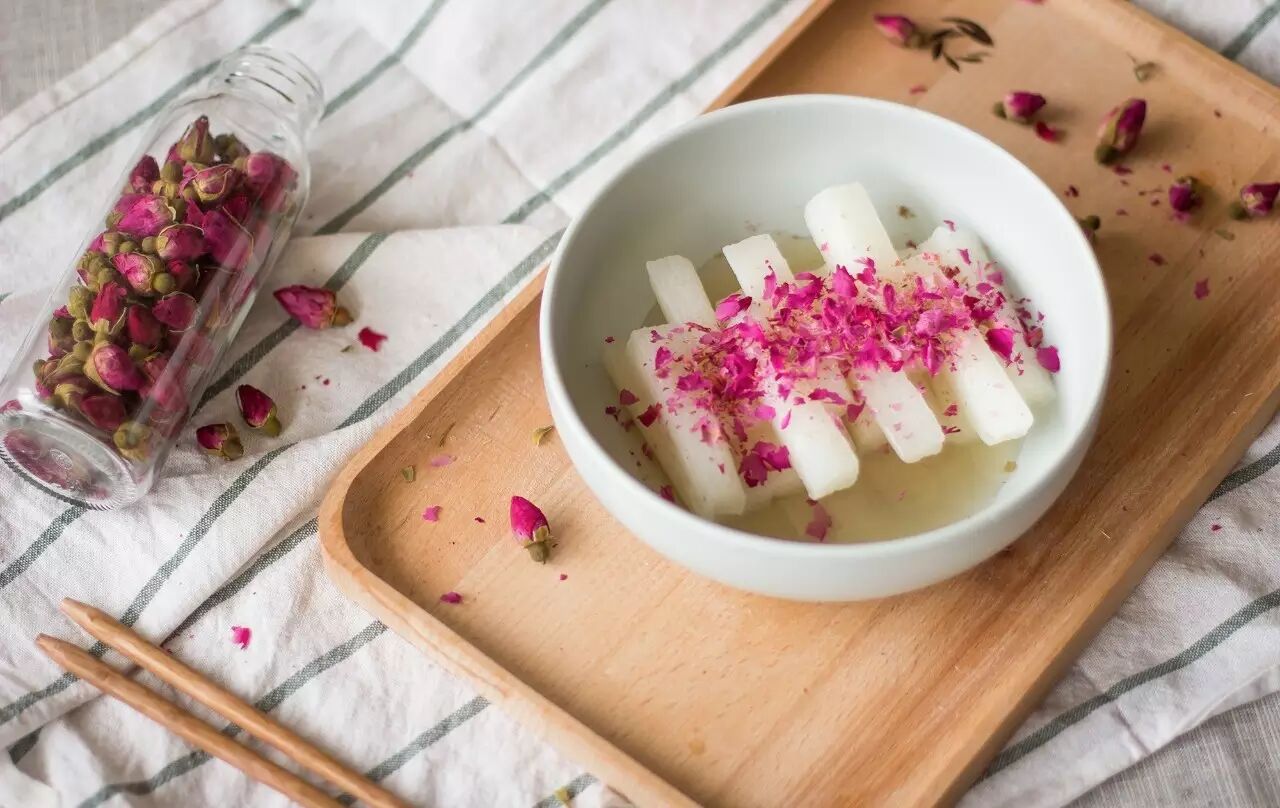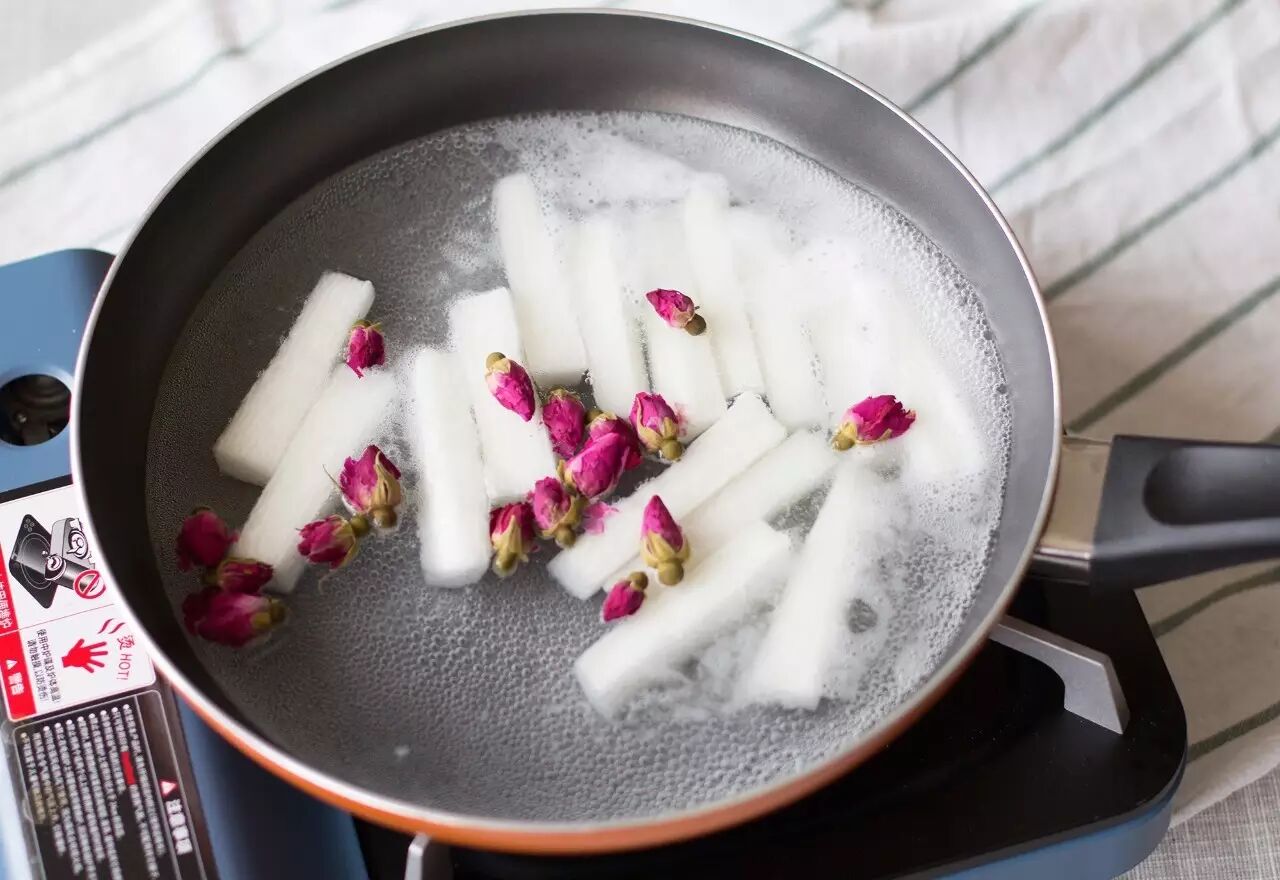 山药洗净去皮后切成长条状,放在烧开水的锅里与玫瑰花同煮