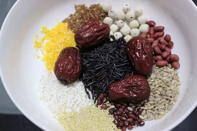 如今的八宝粥并非仅仅八种原料,但合并同类项后主要有四类:米、豆类、干果和中药,米选粳米、糯米或黑糯米,配料选绿豆、红豆、扁豆、红枣、核桃、花生、莲子、桂圆、松子、山药、百合、枸杞、芡实、薏米、葡萄干、板栗、胡萝卜、香肠、咸肉等。