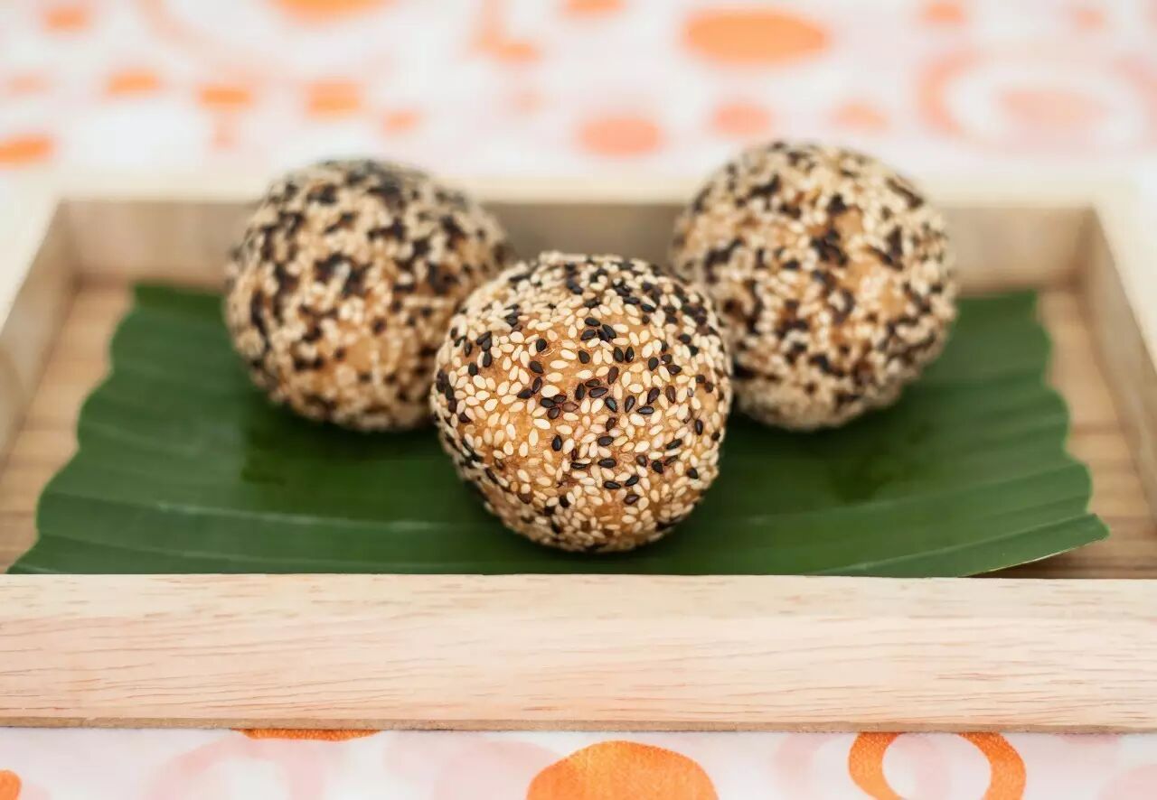 糯米团子沾上白芝麻入油炸,馅料有无都可。南瓜泥、紫薯泥、红薯泥和糯米粉一起和面,红豆沙直接包馅。