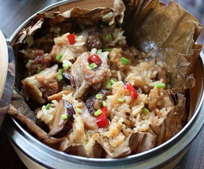 荷叶和粽叶的选择无非是借其清香,喜欢的话,放紫苏叶也能配出不错的味道。对排骨和鸡肉预处理一番可缩短烹饪时间。