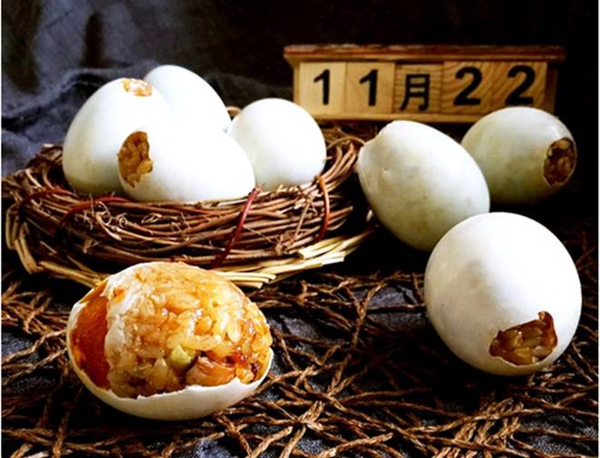 把调了肉丁、香菇的糯米塞进流出蛋清留下蛋黄的生咸鸭蛋里,包上锡纸煮熟。剥开蛋壳,糯米裹着金灿灿流着油的咸蛋黄,馋嘴猫要小心被烫到哦。