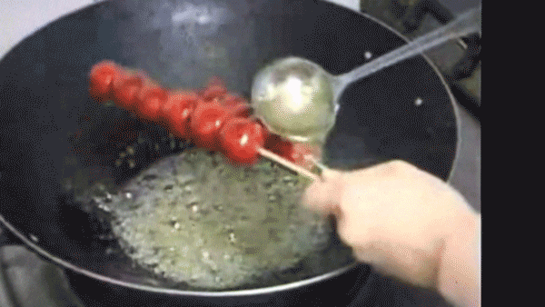 而做糖雪球的时候,糖只要全部溶解在水里变成糖稀就立即关掉火,然后将山楂倒进去和着糖浆一起翻炒冷却。